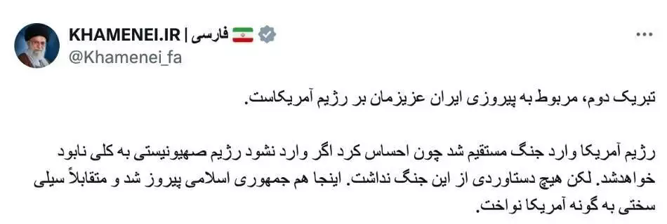 哈梅內(nèi)伊發(fā)文說,美國從這場戰(zhàn)爭中并沒有取得任何成果,伊朗取得了勝利,并狠狠地給了美國一記耳光。